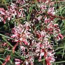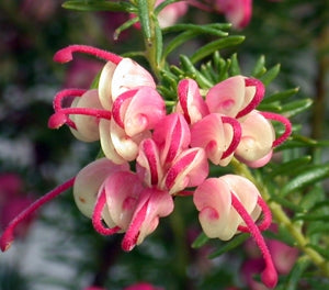 A dwarf, compact native to 60cm. It has fine, dark green foliage and contrasting pink and cream spider flowers over the warmer months.